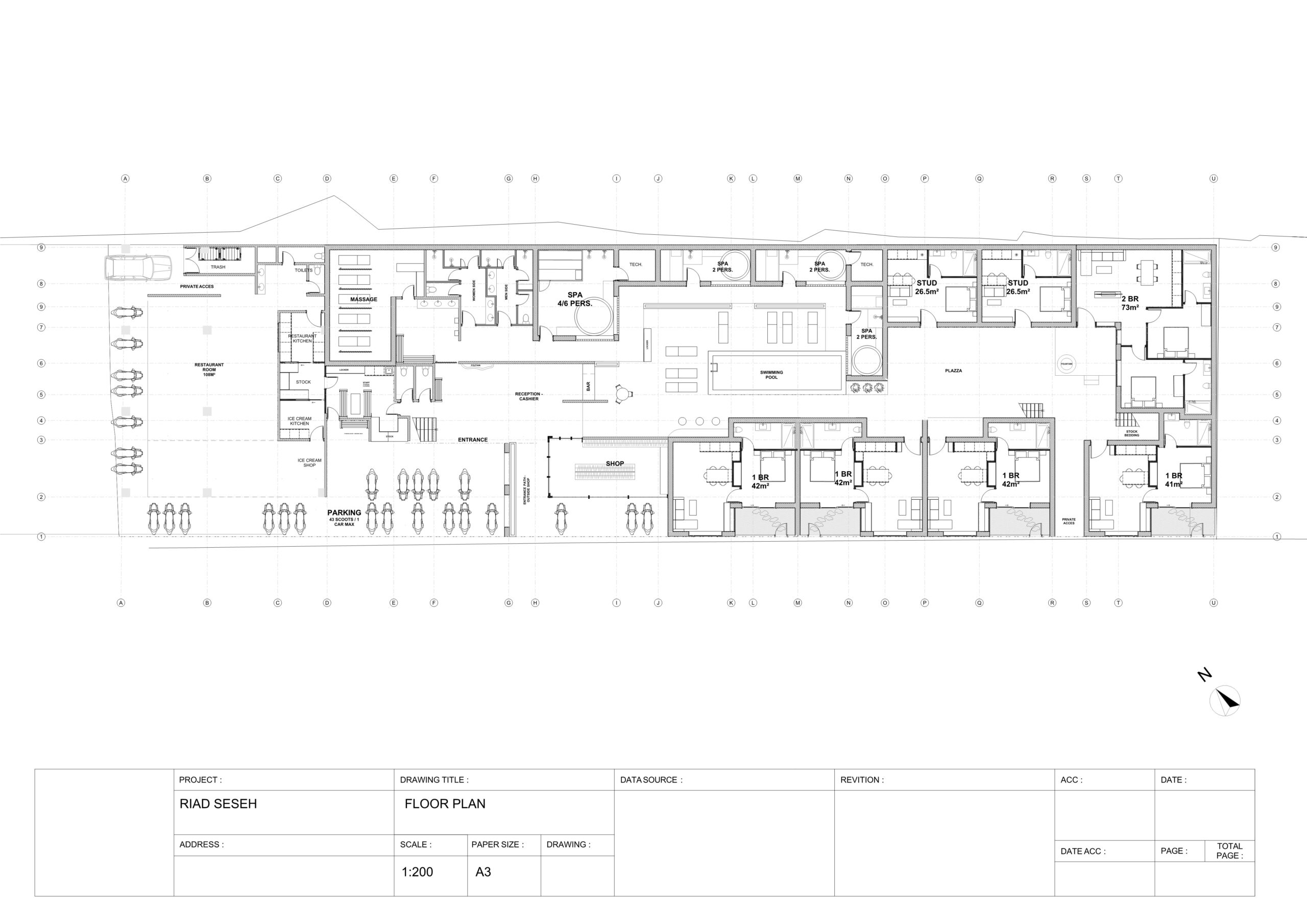 – 3 private spa rooms, a massage parlor – 2 dining areas – 3 shops : a clothing shop, a tattoo parlor, a beauty salon – Rooftop – Swimming Pool