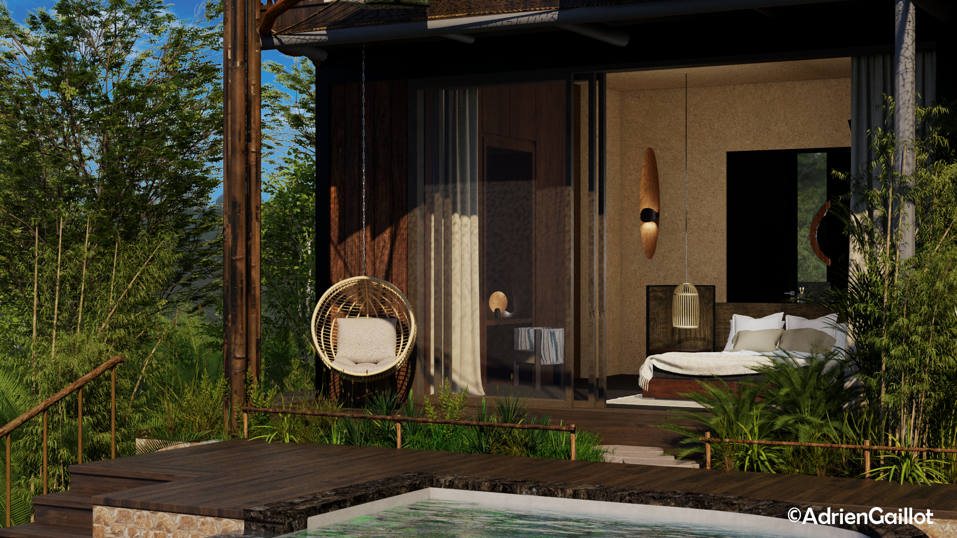 An Exterior Designed for Relaxation The exterior extends this philosophy of integration and comfort. It’s enhanced by a suspended hammock, a sunken garden lounge that invites conviviality, and a waterfall that adds a touch of serenity.