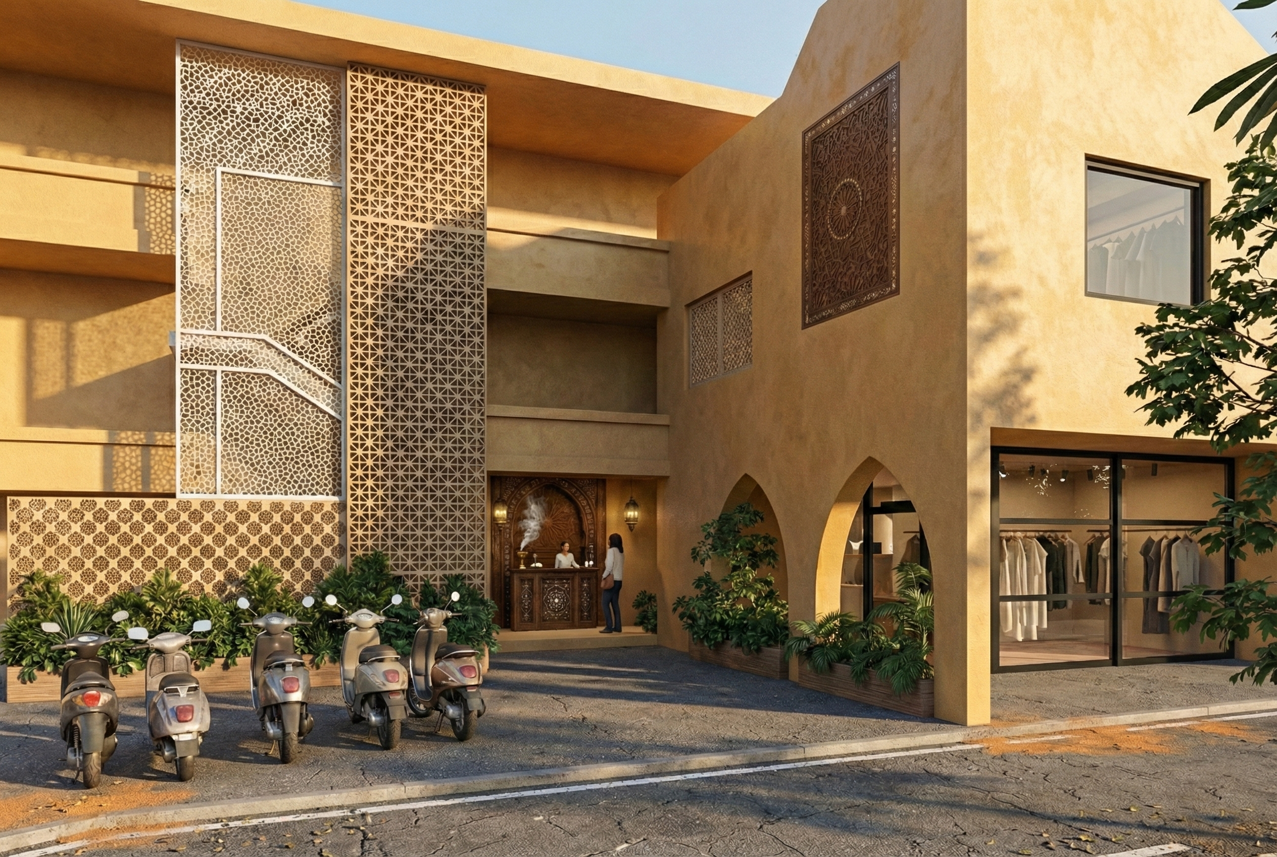 In its design phase, Riad Seseh is a new architectural project that draws on Morocco's heritage. Built around a central courtyard with a refreshing pool, the riad's design is inspired by traditional medinas, using passages and walkways to connect spaces and provide semi-private outdoor areas. It features authentic Moroccan elements like arches, moucharabiehs, and tadelakt, with a warm, ochre color palette that mirrors the serenity of the Moroccan landscape.