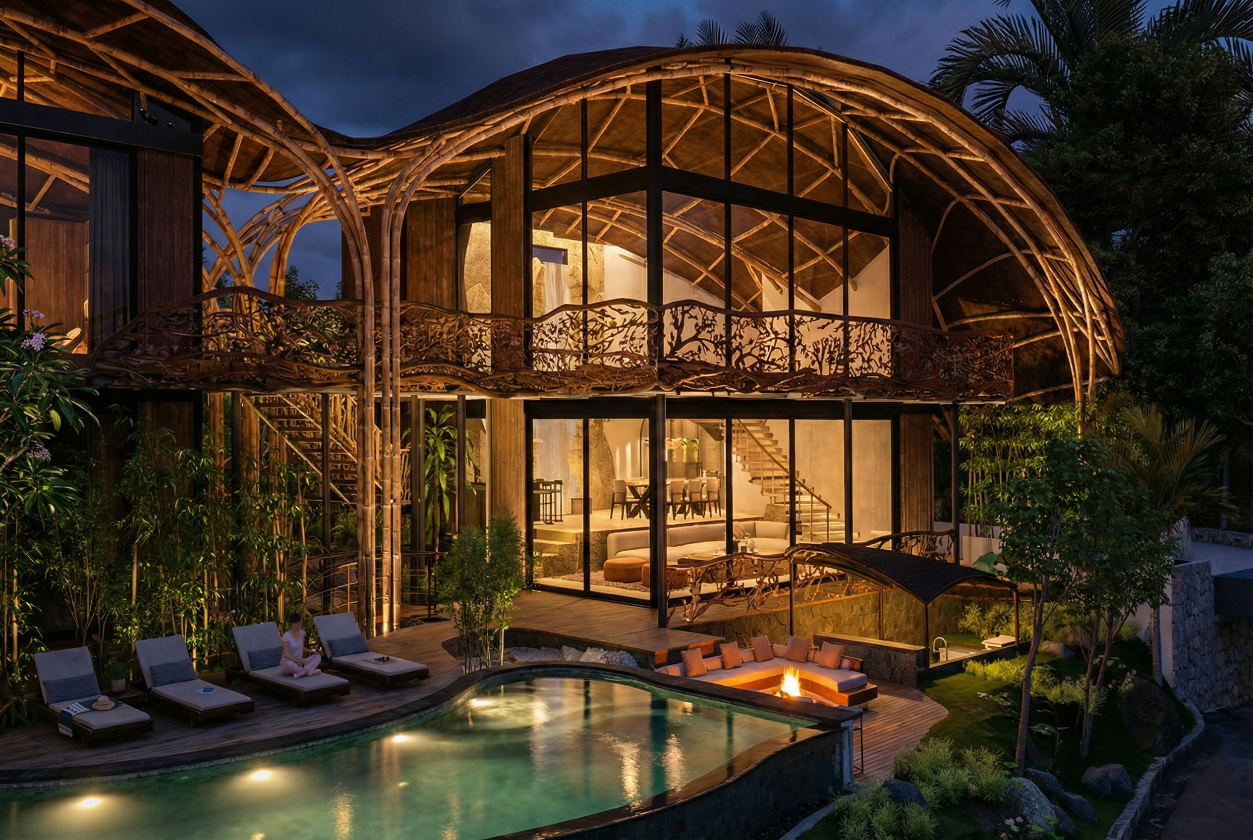 In Tabanan, Villa Celesta was designed to blend with its natural surroundings. Inspired by the organic shapes created by the wind, its architecture uses natural materials like bamboo, wood, and stone. The space feels open and airy thanks to high ceilings and an organically shaped roof. The experience is enhanced by framed views of the jungle and outdoor amenities for relaxation, such as a sunken garden lounge, a suspended hammock, and an organically shaped pool that blends into the landscape.